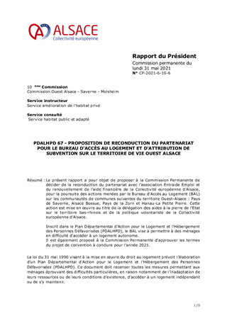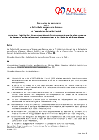 Le présent rapport a pour objet de proposer à la Commission Permanente de décider de la reconduction du partenariat avec l'association Entraide Emploi et du renouvellement de l'aide financière de la Collectivité européenne d’Alsace, pour la poursuite des actions menées par le Bureau d'Accès au Logement (BAL) sur les communautés de communes suivantes du territoire Ouest-Alsace : Pays de Saverne, Alsace Bossue, Pays de la Zorn et Hanau-La Petite Pierre. Cette action est mise en œuvre au titre de la délégation des aides à la pierre de l'Etat sur le territoire bas-rhinois et de la politique volontariste de la Collectivité européenne d’Alsace. Inscrit dans le Plan Départemental d'Action pour le Logement et l'Hébergement des Personnes Défavorisées (PDALHPD), le BAL vise à permettre à des ménages en difficulté d'accéder à un logement autonome. Il est également proposé à la Commission Permanente d'approuver les termes du projet de convention à conclure pour l'année 2021.
