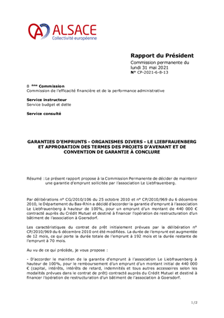 Le présent rapport propose à la Commission Permanente de décider de maintenir une garantie d’emprunt sollicitée par l’association Le Liebfrauenberg.