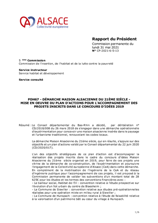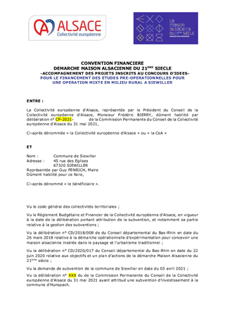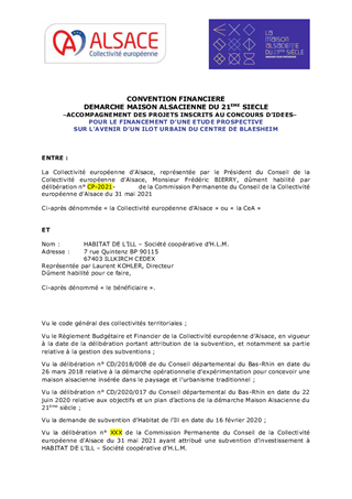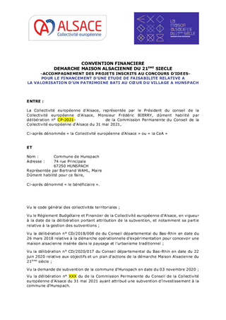 Le Conseil départemental du Bas-Rhin a décidé, par délibération n° CD/2018/008 du 26 mars 2018 de s’engager dans une démarche opérationnelle d’expérimentation pour concevoir une maison alsacienne insérée dans le paysage et l’urbanisme traditionnel, renouvelant les codes locaux. La démarche Maison Alsacienne du 21ème siècle, qui en résulte, s’appuie sur des objectifs et un plan d’actions validé par le Conseil départemental du 22 juin 2020 (CD/2020/017). L’un des objectifs stratégiques de ce plan d’action est d’accompagner la réalisation des projets inscrits dans le cadre du concours d’idées Maison Alsacienne du 21ème siècle organisé en 2019, pour faire de ces projets une vitrine de la démarche de co-construction, de l’expérimentation et poursuivre l’engagement de la Collectivité européenne d’Alsace (CeA) dans cette démarche. En complément de la mobilisation de l’ingénierie de la CeA et du réseau d’ingénierie publique pour l’accompagnement de ces projets, il est proposé à la Commission permanente de valider les subventions d'un montant total de 28 625€ pour les études et les termes des conventions financières avec : - Le bailleur social, Habitat de l’Ill : convention relative à l’étude prospective sur l’évolution d’un îlot urbain du centre de Blaesheim ; - La Commune de Siewiller : convention relative aux études pré-opérationnelles réalisées pour une opération mixte en milieu rural à Siewiller ; - La Commune de Hunspach : convention relative à l’étude de faisabilité relative à la valorisation d’un patrimoine bâti au cœur du village à Hunspach.