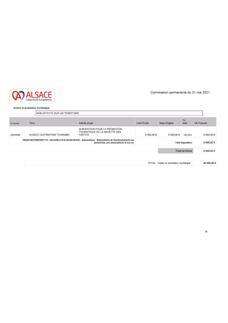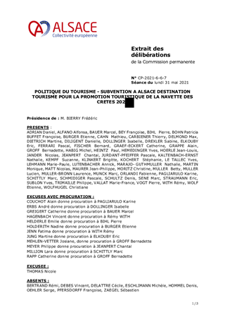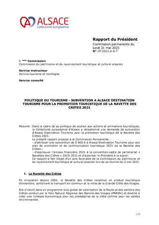 Dans le cadre de sa politique de soutien aux actions et animations touristiques, la Collectivité européenne d’Alsace a réceptionné une demande de subvention d’Alsace Destination Tourisme pour la promotion touristique de la Navette des Crêtes 2021. Le présent rapport propose à la Commission Permanente : - d'attribuer une subvention de 5 000 € à Alsace Destination Tourisme pour son plan de promotion et de communication touristique 2021 de la Navette des Crêtes ; - d’approuver l’annexe financière 2021 à la convention-cadre de partenariat « Navettes des Crêtes » 2019-2021 et d’autoriser le Président à la signer. Ce rapport a fait l’objet d’un avis favorable de la Commission du patrimoine et du rayonnement touristique et culturel alsacien lors de sa réunion du 3 mai 2021.