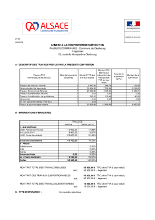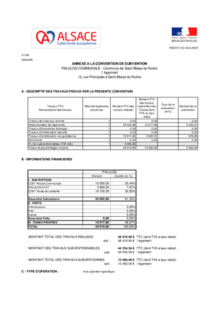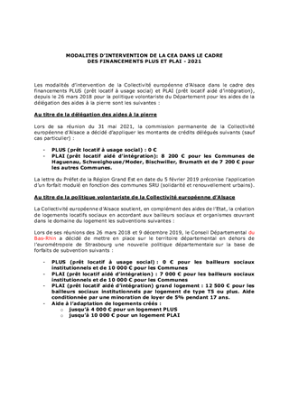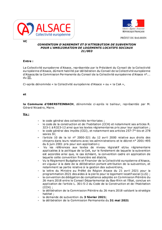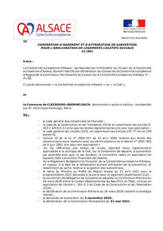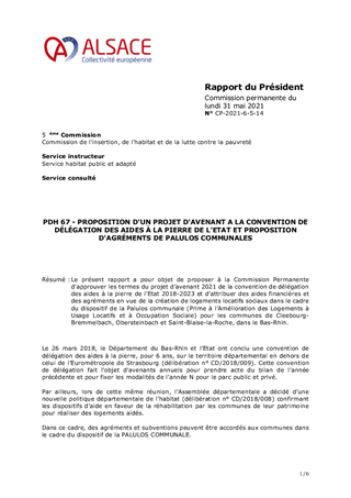 Le présent rapport a pour objet de proposer à la Commission Permanente d'approuver les termes du projet d’avenant 2021 de la convention de délégation des aides à la pierre de l’Etat 2018-2023 et d’attribuer des aides financières et des agréments en vue de la création de logements locatifs sociaux dans le cadre du dispositif de la Palulos communale (Prime à l’Amélioration des Logements à Usage Locatifs et à Occupation Sociale) pour les communes de Cleebourg-Bremmelbach, Obersteinbach et Saint-Blaise-la-Roche, dans le Bas-Rhin.