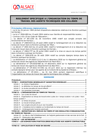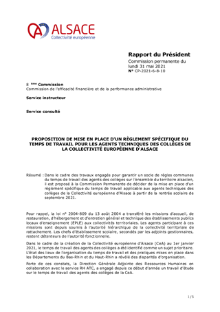 Dans le cadre des travaux engagés pour garantir un socle de règles communes du temps de travail des agents des collèges sur l’ensemble du territoire alsacien, il est proposé à la Commission Permanente de décider de la mise en place d’un règlement spécifique du temps de travail applicable aux agents techniques des collèges de la Collectivité européenne d’Alsace à partir de la rentrée scolaire de septembre 2021.