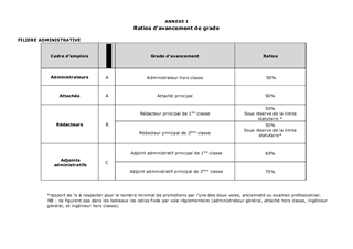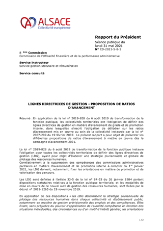 En application de la loi n° 2019-828 du 6 août 2019 de transformation de la fonction publique, les collectivités territoriales ont l’obligation de définir des lignes directrices de gestion en matière d’avancement de grade et de promotion interne, dans lesquelles s’inscrit l’obligation de délibérer sur les ratios d’avancement mis en œuvre au sein de la collectivité instaurée par la loi n° 2007-209 du 19 février 2007. Le présent rapport a pour objet de présenter les différentes propositions de ratios d’avancement à mettre en œuvre dès la campagne d’avancement 2021.