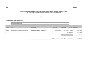 Le présent rapport a pour objet de proposer à la Commission Permanente l'attribution de subventions aux collectivités dans le domaine de la voirie. Au titre du dispositif d'aides à l'aménagement des routes départementales en agglomération pour les communes haut-rhinoises, il est proposé d'affecter un montant de 10 137,00 € pour un(1) dossier en agglomération de Niffer, au bénéfice de Mulhouse Alsace Agglomération.