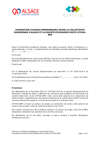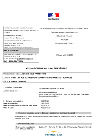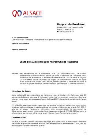 Par délibération du 4 novembre 2016 (n° CP-2016-10-5-4), le Conseil départemental du Haut-Rhin a décidé de céder le bâtiment de l’ancienne sous-préfecture de Mulhouse à la société d’économie mixte CITIVIA-SEM. A ce jour, CITIVIA-SEM a trouvé un porteur de projet, un compromis de vente a été signé et les recours sont purgés. Pour autant, compte tenu de la situation sanitaire, le porteur de projet demande un étalement du paiement de la somme convenue.
