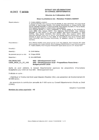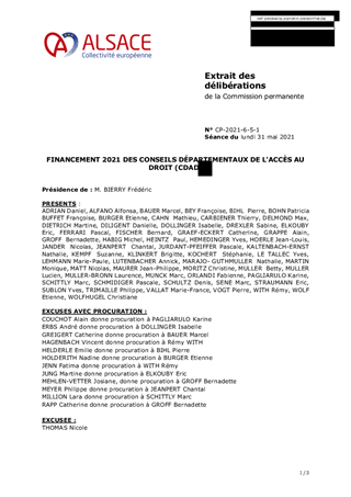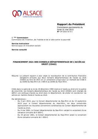 Le présent rapport a pour objet la reconduction de la contribution financière obligatoire annuelle aux deux Conseils départementaux de l’accès au droit (CDAD) au titre de 2021 en un versement unique pour un montant de 9 600 € au CDAD du Bas-Rhin et 1 006 € au CDAD du Haut-Rhin.
