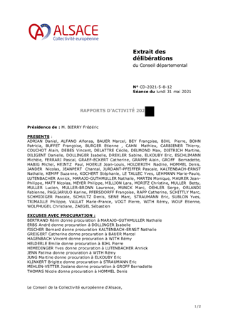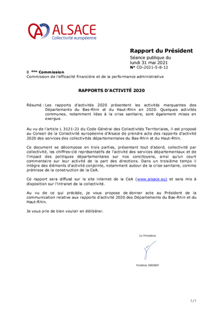 Les rapports d’activités 2020 présentent les activités marquantes des Départements du Bas-Rhin et du Haut-Rhin en 2020. Quelques activités communes, notamment liées à la crise sanitaire, sont également mises en exergue.