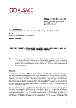 Le présent rapport propose, au titre de la programmation castrale alsacienne "Les Portes du Temps", d'attribuer et d'autoriser le versement d’une subvention de fonctionnement pour un montant total de 10 000 € à l’association Out of Cinema, réalisant une animation au château de Landskron dans le cadre de sa programmation.