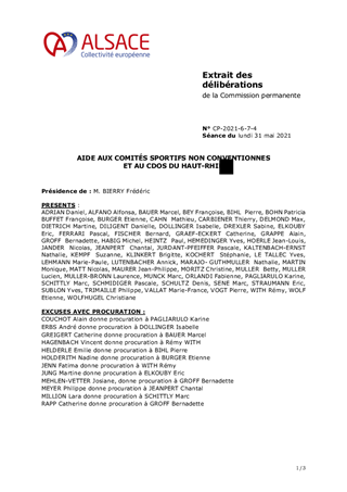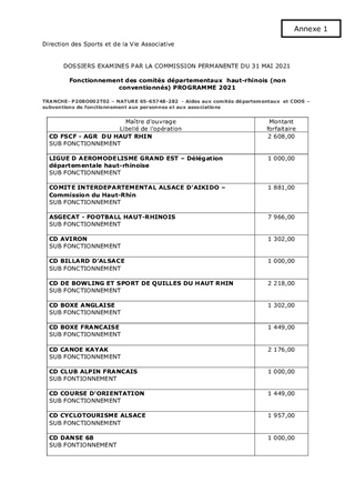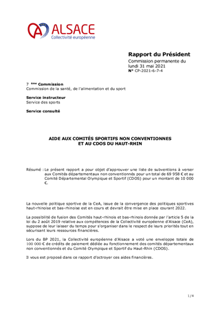 Lors du Budget Primitif 2021, la Collectivité européenne d’Alsace (CeA) a voté une enveloppe totale de crédits de paiement de 4 663 600 € au titre du soutien au sport et à la vie associative. En 2021, les politiques sportives respectives des deux anciens Départements s’appliqueront dans les mêmes conditions qu’en 2020. Il vous est proposé dans le présent rapport de voter un soutien à l'Union Générale Sportive de l'Enseignement Libre Alsace (UGSEL Alsace) et aux Services Départementaux de l'Union Nationale du Sport Scolaire du Bas-Rhin (SDUNSS67) et du Haut-Rhin (SDUNSS 68), ainsi qu'au Cercle de Voile de Mulhouse (CVM) prévu au B.P. 2021. Le total de l'enveloppe à engager dans ce rapport s'élève à 84 400 € en dépenses de fonctionnement. Le dossier a été soumis à la 7ème Commission (Santé, Alimentation et Sport) du 3 mai 2021.