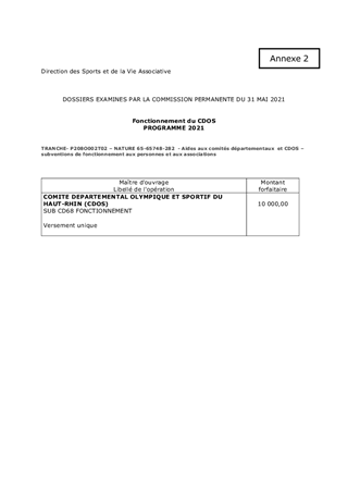 Le présent rapport a pour objet d’approuver une liste de subventions à verser aux Comités départementaux non conventionnés pour un total de 69 958 € et au Comité Départemental Olympique et Sportif (CDOS) pour un montant de 10 000 €.