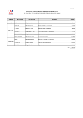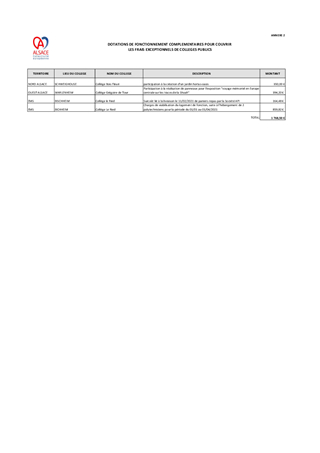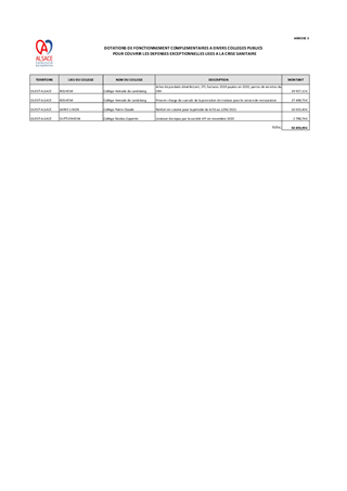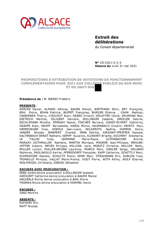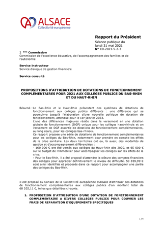 Le Bas-Rhin et le Haut-Rhin présentent des systèmes de dotations de fonctionnement aux collèges publics différents : une différence qui se poursuivra jusqu’à l’élaboration d’une nouvelle politique de dotation de fonctionnement, attendue pour le 1er janvier 2023. L’une des différences majeures réside dans le versement en une dotation globale de fonctionnement (DGF) unique pour les collèges haut-rhinois et un versement de DGF assortie de dotations de fonctionnement complémentaires, au long cours, pour les collèges bas-rhinois. Ce rapport propose une série de dotations de fonctionnement complémentaires pour les collèges du Bas-Rhin, notamment pour prendre en compte les effets de la crise sanitaire. Les deux territoires ont eu, là aussi, des modalités de gestion et d’accompagnement différenciées : - 160 000 € ont été versés aux collèges du Haut-Rhin dès 2020, et 65 000 € sur le budget de l’immobilier pour accompagner les collèges sur les effets de la crise, - Pour le Bas-Rhin, il a été proposé d’attendre la clôture des comptes financiers des collèges pour apprécier définitivement le niveau de difficulté. 50 859,99 € sont ainsi identifiés et proposés dans ce rapport pour accompagner une partie des collèges du Bas-Rhin.