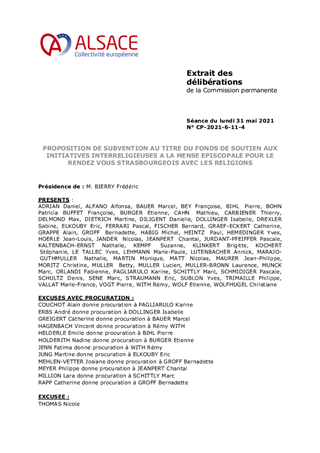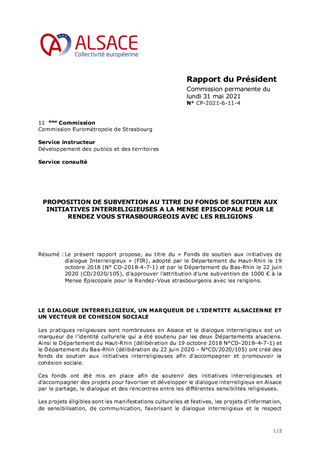 Le présent rapport propose, au titre du « Fonds de soutien aux initiatives de dialogue Interreligieux » (FIR), adopté par le Département du Haut-Rhin le 19 octobre 2018 (N° CD-2018-4-7-1) et par le Département du Bas-Rhin le 22 juin 2020 (CD/2020/105), d’approuver l’attribution d’une subvention de 1000 € à la Mense Episcopale pour le Rendez-Vous strasbourgeois avec les religions.