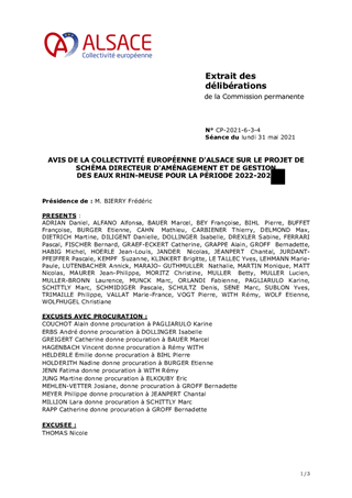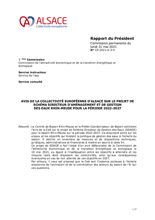 Le Comité de Bassin Rhin-Meuse et le Préfet Coordonnateur de Bassin sollicitent l'avis de la CeA sur le projet de Schéma Directeur de Gestion des Eaux (SDAGE) pour le bassin Rhin-Meuse sur la période 2022-2027. Ce document porte sur les enjeux et les objectifs qui fondent la politique de gestion des eaux à l'échelle du bassin. Il décline un ensemble de mesures et de dispositions techniques, juridiques, administratives et financières à mettre en œuvre à cette fin. Ce projet de SDAGE a fait l’objet d’un avis défavorable de la Commission de l’attractivité économique et de la transition énergétique et écologique le 10 mai 2021, eu égard à l'inadéquation entre les objectifs à atteindre et les moyens réels dont disposent les collectivités, ainsi qu'aux conséquences éventuelles en cas de non atteinte de ces objectifs en 2027. Par ailleurs, il vous est proposé que la CeA soit l’instance porteuse à l’échelle alsacienne de l’animation et de la coordination des acteurs du bassin de l’Ill sur ces questions.