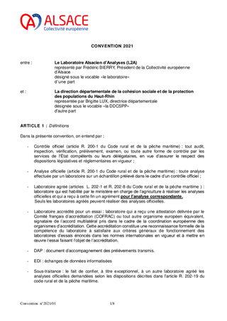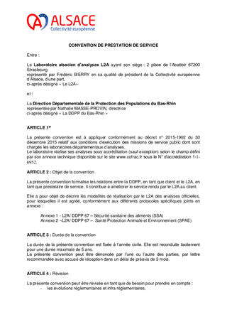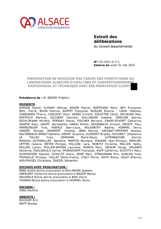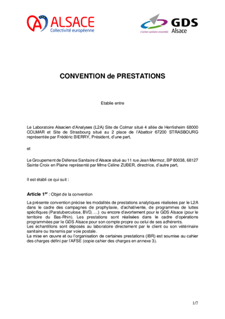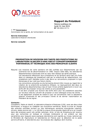 Les missions de veille sanitaire ont été confiées aux Départements par les premières lois de décentralisation en 1982. Depuis cette date, les laboratoires départementaux d’analyses sont au cœur des réseaux de santé publique. Les laboratoires effectuent leurs prestations et les tarifient selon des prix fixés dans un catalogue de prestations voté par la collectivité de rattachement. Les prestations sont réalisées suite à des devis ou conventions proposant le type d’analyses et leur coût aux futurs clients. Les conventions annuelles ou pluriannuelles doivent être revues au regard de la création de la collectivité européenne d’Alsace. Le regroupement des deux ex laboratoires départementaux bas et haut-rhinois amène également à revoir ces tarifs afin de proposer à tous les clients un prix acceptable. Il est donc proposé une révision des tarifs 2021 pour les prestations assurées sur les deux sites du L2A afin de proposer un seul catalogue à tous les clients. Il est également proposé de mettre à jour les conventions liant le laboratoire alsacien d’analyses et ses principaux clients et de donner l’autorisation au Président de les signer.