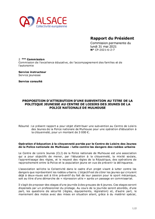 Le présent rapport a pour objet d'attribuer une subvention au Centre de Loisirs des Jeunes de la Police nationale de Mulhouse pour une opération d'éducation à la citoyenneté, pour un montant de 3 000 €.