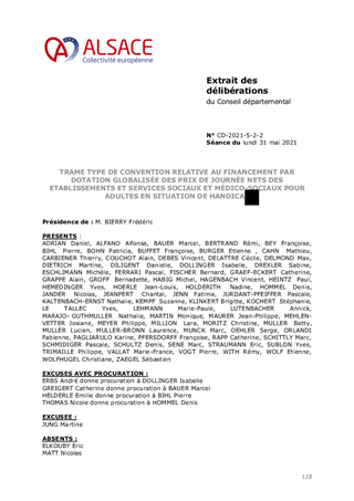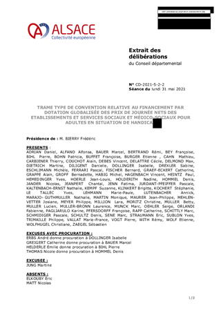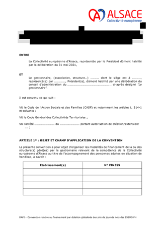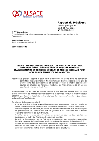 Le présent rapport a pour objet d'approuver la trame type de convention permettant le déploiement du financement par dotation globalisée des prix de journée nets des établissements et services sociaux et médico-sociaux pour adultes en situation de handicap, modalités de financement déjà en vigueur pour les structures du Haut-Rhin.