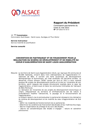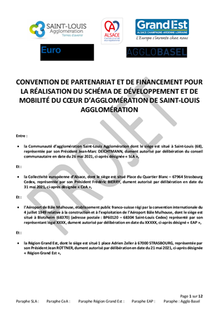 Le territoire de Saint-Louis Agglomération (SLA), qui regroupe 40 communes et 80.000 habitants, s’inscrit dans l’aire métropolitaine de l’agglomération tri-nationale de Bâle. Il connait une forte dynamique de développement démographique et économique, qui s’est accélérée ces dernières années. La démarche «Vision d’Avenir 2030» lancée par SLA en 2017 a ainsi recensé quelque 80 projets de développements publics et privés sur l’ensemble de son territoire, parmi lesquels des projets structurants localisés dans le cœur de l’agglomération, à Saint-Louis et dans les communes limitrophes de l’aéroport de Bâle-Mulhouse. La réalisation de l’ensemble de ces projets de développement économique et urbain, d’équipement du territoire et d’infrastructures est de nature à profondément modifier l’attractivité, le paysage et le fonctionnement de l’agglomération. Le présent rapport vise à contractualiser le partenariat nécessaire à la réalisation du schéma de développement et de mobilité du cœur d’agglomération de SLA pour: - définir les modalités de fonctionnement de ce partenariat; - déterminer les conditions du financement des études et leur maîtrise d’ouvrage; - décrire l’organisation du pilotage et du suivi des études; - décrire les caractéristiques des études à engager : nature et calendrier prévisionnel.