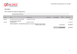 La Collectivité européenne d’Alsace est responsable de la construction, de la reconstruction, de l'extension, des grosses réparations des bâtiments, de l'équipement, du fonctionnement, de l’accueil, de la restauration, de l’hébergement, de l’entretien général et technique, du recrutement et de la gestion des personnels techniciens, ouvriers et de service exerçant leurs missions dans les collèges publics du Bas-Rhin. Le Bas-Rhin et le Haut-Rhin présentent des systèmes de financement du fonctionnement aux collèges publics différents, cette différence se poursuivra jusqu’à l’élaboration d’une nouvelle politique de dotation de fonctionnement, attendue pour le 1er janvier 2023. L’une des différences réside dans le versement de subventions d’investissement aux collèges publics du Bas-Rhin pour l’acquisition d’équipements et matériels divers. Le présent rapport a pour objet de proposer à la Commission permanente d’attribuer des subventions d'investissement aux collèges publics du Bas-Rhin pour l'acquisition d'équipements divers, pour un montant total de 33 594 €.