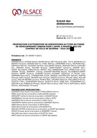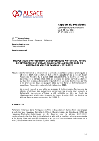 Conformément à la loi relative à la Ville et à la cohésion urbaine promulguée le 21 février 2014, le Département du Bas-Rhin a adopté lors de la réunion de son Assemblée Plénière du 6 juillet 2015 (CD/2015/84), le Contrat de Ville de Saverne pour la période 2015-2020. Ce contrat a été conclu par le Département du Bas-Rhin et ses partenaires le 10 juillet 2015. La durée des Contrats de Ville a été prorogée de deux ans jusqu’en 2022 au titre de la Loi de Finances 2019, adopté par l'Assemblée nationale le 20 décembre 2018. Le présent rapport a pour objet de proposer à la Commission Permanente de décider d’attribuer des subventions concernant les projets pour lesquels la Collectivité européenne d'Alsace a été sollicitée au titre du fonds de développement urbain, dans le cadre de l'appel à projets 2021 du Contrat de Ville de Saverne pour un montant de 25 000 €.