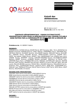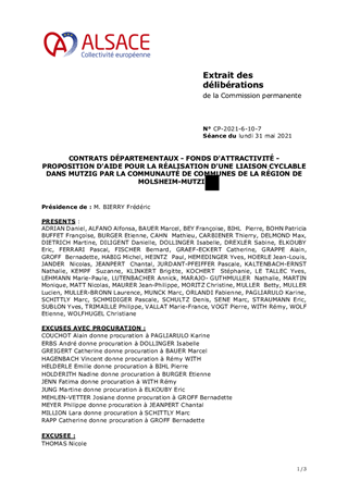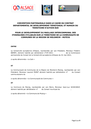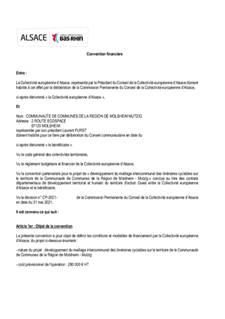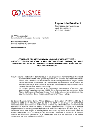 Suite à l’adaptation de la Politique de Développement Territorial haut-rhinoise et du Plan Patrimoine 68 ainsi que de la politique des contrats départementaux bas-rhinois pour l’année 2021 la déclinaison de l’accompagnement des projets portés par les territoires se poursuit. La Communauté de communes de la Région de Molsheim-Mutzig a ainsi présenté un projet d'aménagement cyclable qui entre dans ce dispositif de soutien transitoire. Le présent rapport propose à la Commission permanente d’attribuer une subvention d’investissement de 28 000 € à la Communauté de communes de la Région de Molsheim-Mutzig au titre du Fonds de Développement et d’Attractivité, pour la réalisation d'une liaison cyclable dans la Ville de Mutzig.
