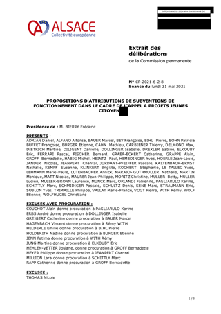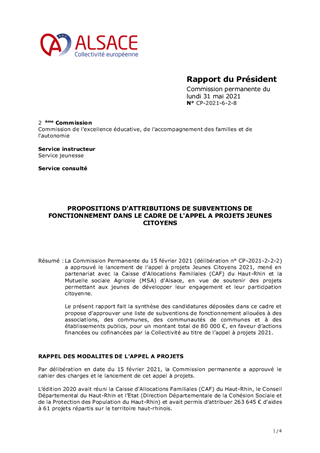 La Commission Permanente du 15 février 2021 (délibération n° CP-2021-2-2-2) a approuvé le lancement de l’appel à projets Jeunes Citoyens 2021, mené en partenariat avec la Caisse d’Allocations Familiales (CAF) du Haut-Rhin et la Mutuelle sociale Agricole (MSA) d’Alsace, en vue de soutenir des projets permettant aux jeunes de développer leur engagement et leur participation citoyenne. Le présent rapport fait la synthèse des candidatures déposées dans ce cadre et propose d’approuver une liste de subventions de fonctionnement allouées à des associations, des communes, des communautés de communes et à des établissements publics, pour un montant total de 80 000 €, en faveur d’actions financées ou cofinancées par la Collectivité au titre de l’appel à projets 2021.
