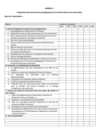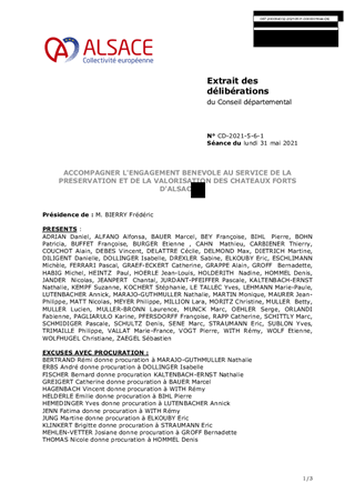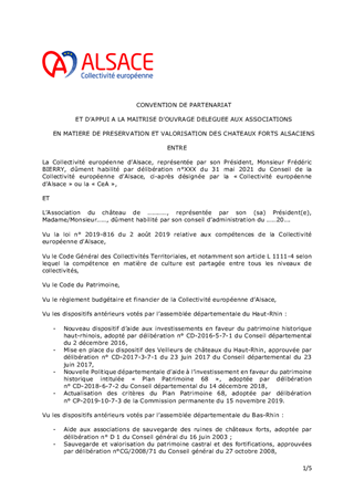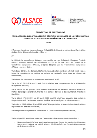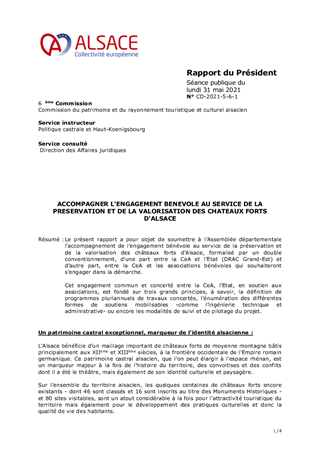 Le présent rapport a pour objet de soumettre à l’Assemblée départementale l’accompagnement de l’engagement bénévole au service de la préservation et de la valorisation des châteaux forts d’Alsace, formalisé par un double conventionnement, d’une part entre la CeA et l’Etat (DRAC Grand-Est) et d’autre part, entre la CeA et les associations bénévoles qui souhaiteront s’engager dans la démarche. Cet engagement commun et concerté entre la CeA, l’Etat, en soutien aux associations, est fondé sur trois grands principes, à savoir, la définition de programmes pluriannuels de travaux concertés, l’énumération des différentes formes de soutiens mobilisables -comme l’ingénierie technique et administrative- ou encore les modalités de suivi et de pilotage du projet.
