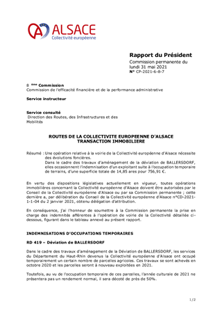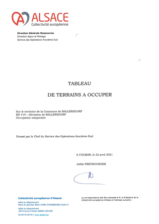 Une opération relative à la voirie de la Collectivité européenne d’Alsace nécessite des évolutions foncières. Dans le cadre des travaux d’aménagement de la déviation de BALLERSDORF, elles occasionnent l’indemnisation d’un exploitant suite à l’occupation temporaire de terrains, d’une superficie totale de 14,85 ares pour 756,91 €.