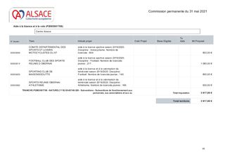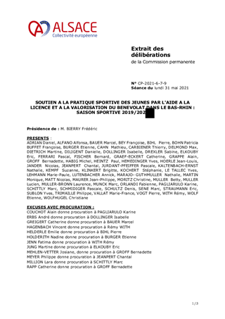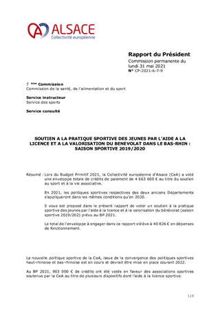 Lors du Budget Primitif 2021, la Collectivité européenne d’Alsace (CeA) a voté une enveloppe totale de crédits de paiement de 4 663 600 € au titre du soutien au sport et à la vie associative. En 2021, les politiques sportives respectives des deux anciens Départements s’appliqueront dans les mêmes conditions qu’en 2020. Il vous est proposé dans le présent rapport de voter un soutien à la pratique sportive des jeunes par l'aide à la licence et à la valorisation du bénévolat (saison sportive 2019/202) prévu au BP 2021. Le total de l'enveloppe à engager dans ce rapport s'élève à 40 826 € en dépenses de fonctionnement.