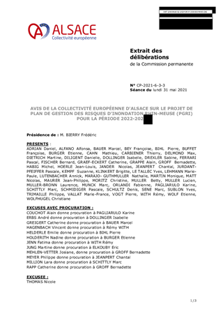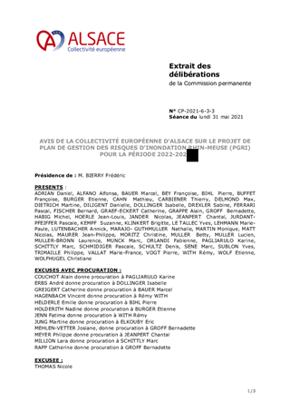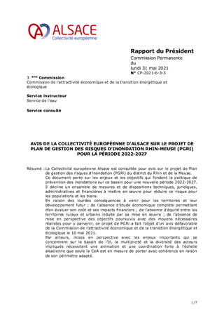 La Collectivité européenne Alsace est consultée pour avis sur le projet de Plan de gestion des risques d’inondation (PGRi) du district du Rhin et de la Meuse. Ce document porte sur les enjeux et les objectifs qui fondent la politique de prévention des inondations sur ce bassin pour une nouvelle période 2022-2027. Il décline un ensemble de mesures et de dispositions techniques, juridiques, administratives et financières à mettre en œuvre pour réduire ce risque pour les populations et les biens. En raison des lourdes conséquences à venir pour les territoires et leur développement futur ; de l’absence d’étude économique complète permettant d’en évaluer son coût et ses impacts financiers ; de l’absence d’équité entre les territoires ruraux et urbains induite par sa mise en œuvre ; de l’absence de mise en perspective des objectifs poursuivis avec des moyens nécessaires réalistes pour y parvenir, ce projet de PGRi a fait l’objet d’un avis défavorable de la Commission de l’attractivité économique et de la transition énergétique et écologique le 10 mai 2021. Par ailleurs, mises en perspective avec les enjeux importants qui se concentrent sur le bassin de l’Ill, la multiplicité et la diversité des acteurs impliqués nécessitent une animation et une coordination forte à l’échelle alsacienne que seule la CeA est en mesure de porter avec cohérence en raison de son périmètre adapté.