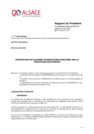 Le présent rapport a pour objet de proposer à la Commission permanente : - l'acquisition d'une parcelle à SOMMERAU de 0,07 are pour un montant de 15,00 € ; - la cession d'une parcelle à SIEWILLER de 0,88 are pour un montant global de 704,00 € ; - le déclassement de deux parcelles de 4,63 ares au total à RIMSDORF et leur intégration au domaine privé de la CeA.