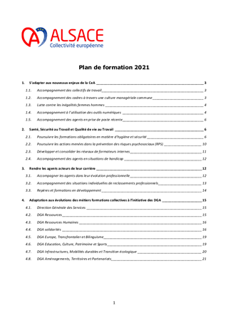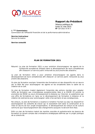 Le plan de formation 2021 a pour ambition d’accompagner les agents de la Collectivité européenne d'Alsace dans le développement de leurs compétences afin d’assurer un service public renouvelé au plus proche des alsaciens.