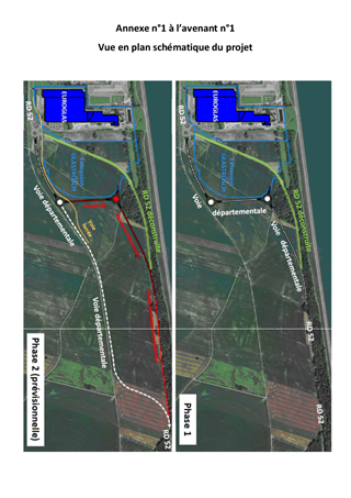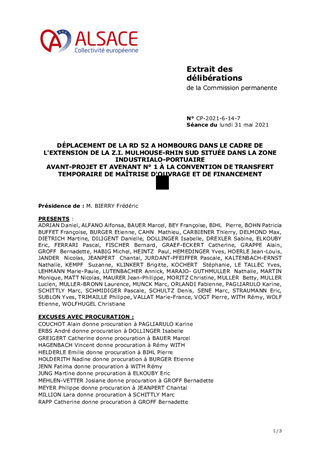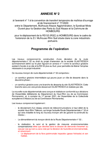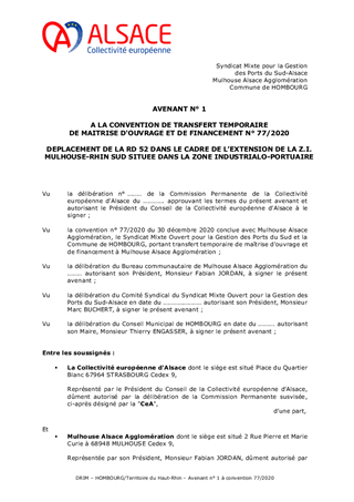 Le présent rapport a pour objet d'approuver les études d’avant-projet et d’entériner en conséquence l’avenant n° 1 à la convention n° 77/2020 de transfert temporaire de maîtrise d’ouvrage et de financement pour la réalisation de la déviation de la RD 52 dans le cadre de l’extension de la Z.I. Mulhouse-Rhin Sud située dans la zone industrialo-portuaire (phase 1), signée avec Mulhouse Alsace Agglomération, le Syndicat Mixte Ouvert pour la Gestion des Ports du Sud-Alsace et la Commune de HOMBOURG, qui prend acte du programme des travaux, avec la création de deux giratoires permettant le rétablissement de la RD 52 ainsi que le raccordement au nouvel accès à la Société GLASTRÖSCH, sans incidence sur l’enveloppe prévisionnelle initialement prévue.