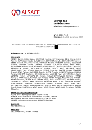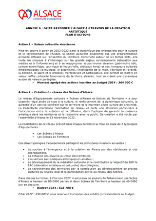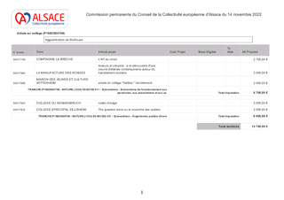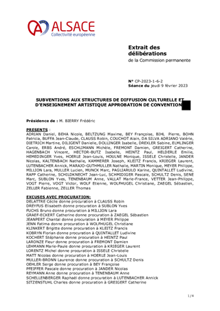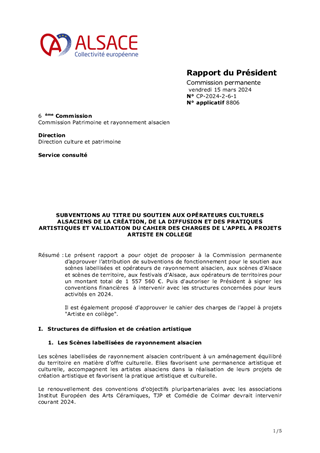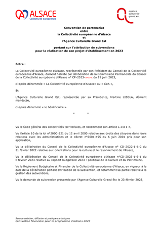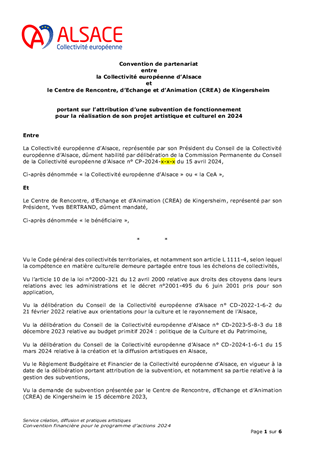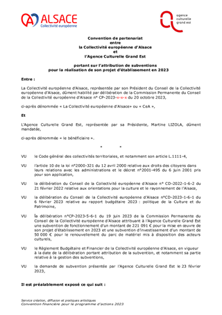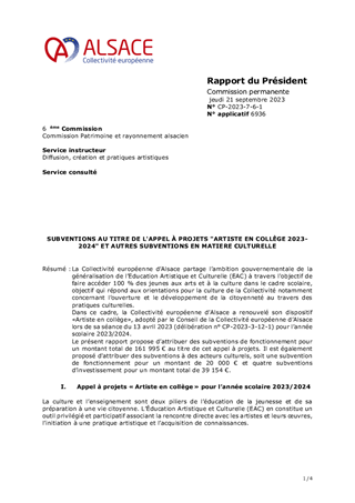 La Collectivité européenne d’Alsace partage l’ambition gouvernementale de la généralisation de l’Education Artistique et Culturelle (EAC) à travers l'objectif de faire accéder 100 % des jeunes aux arts et à la culture dans le cadre scolaire, objectif qui répond aux orientations pour la culture de la Collectivité notamment concernant l’ouverture et le développement de la citoyenneté au travers des pratiques culturelles. Dans ce cadre, la Collectivité européenne d’Alsace a renouvelé son dispositif «Artiste en collège», adopté par le Conseil de la Collectivité européenne d’Alsace lors de sa séance du 13 avril 2023 (délibération n° CP-2023-3-12-1) pour l’année scolaire 2023/2024. Le présent rapport propose d’attribuer des subventions de fonctionnement pour un montant total de 161 995 € au titre de cet appel à projets. Il est également proposé d'attribuer des subventions à des acteurs culturels, soit une subvention de fonctionnement pour un montant de 20 000 € et quatre subventions d’investissement pour un montant total de 39 154 €.