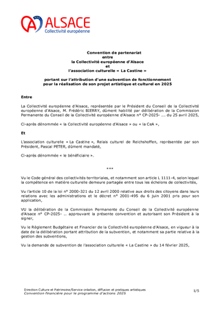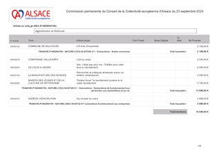 Le présent rapport a pour objet de proposer à la Commission permanente d’approuver l’attribution de subventions pour le soutien aux opérateurs culturels d'échelle alsacienne pour un montant total de 3 614 638 € en fonctionnement et d'autoriser le Président à signer les conventions financières à intervenir avec les structures concernées pour leurs activités en 2025.