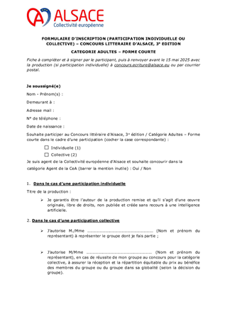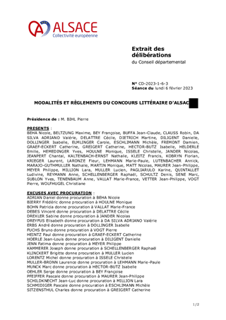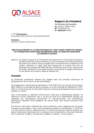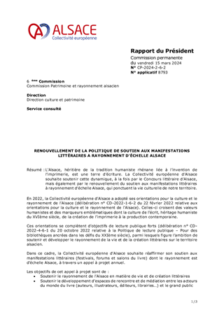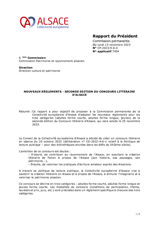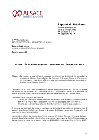 Ce rapport a pour objet de proposer au Conseil de la Collectivité européenne d'Alsace de décider des modalités du Concours littéraire d’Alsace et d’approuver les termes des règlements afférents aux trois catégories (adultes forme courte, adultes forme longue, jeunes).