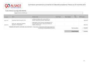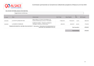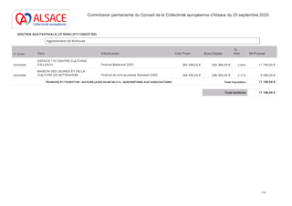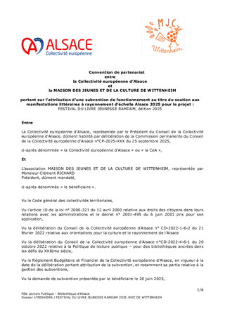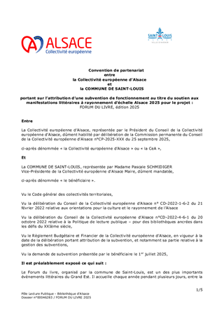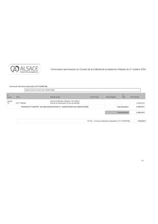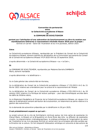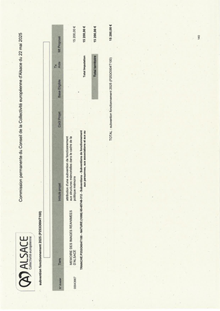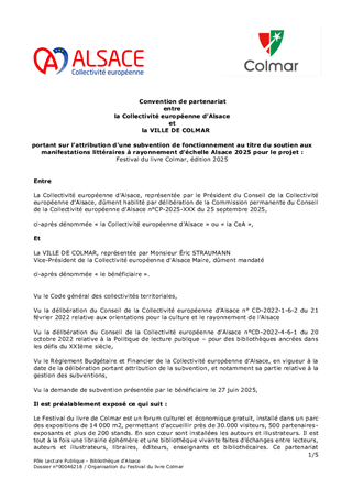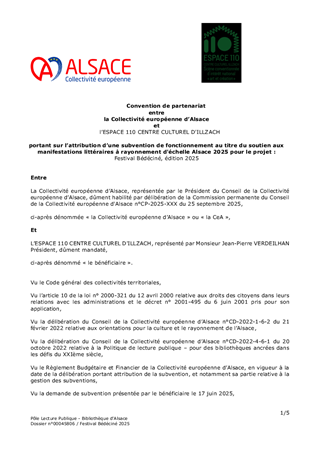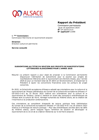 Le présent rapport a pour objet de proposer à la Commission permanente d’approuver l’attribution de subventions pour le soutien aux projets de manifestations littéraires dont le rayonnement est d'échelle Alsace, pour l'année 2025 et pour un montant total de 34 200 € en fonctionnement, et d'autoriser le Président à signer les conventions financières avec les porteurs de projet concernés.