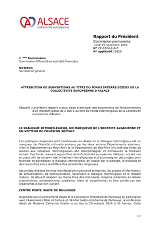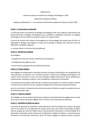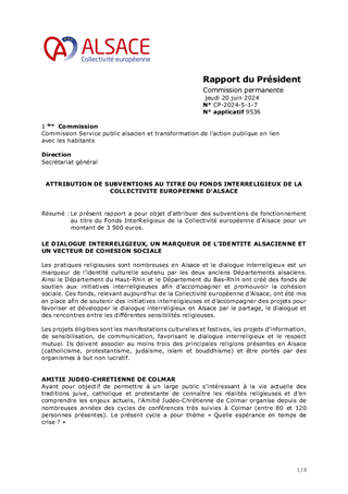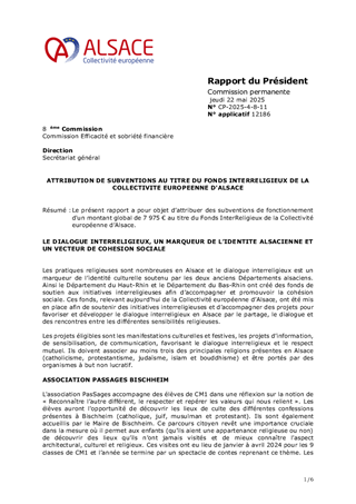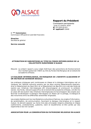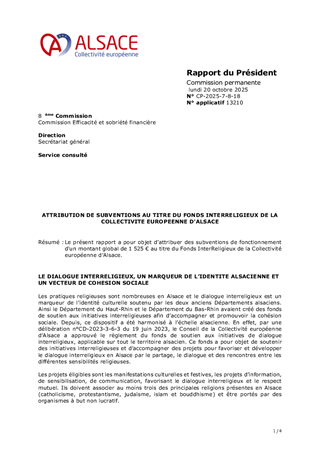 Le présent rapport a pour objet d'attribuer des subventions de fonctionnement au titre du Fonds InterReligieux de la Collectivité européenne d'Alsace pour un montant de 4 000 euros.