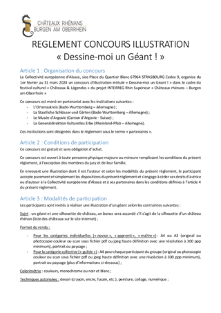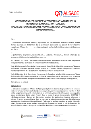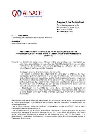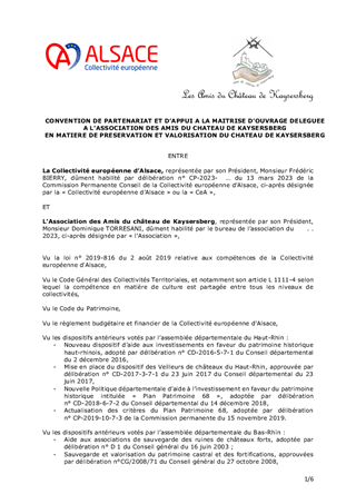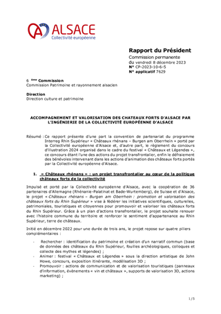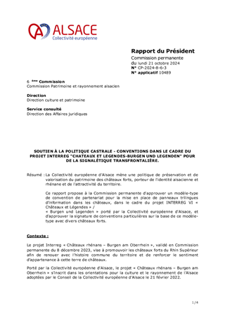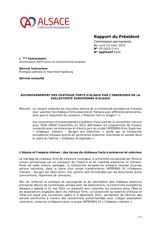 Ce rapport présente les nouvelles actions de la Collectivité européenne d'Alsace pour valoriser les châteaux forts alsaciens et rhénans avec différents partenaires, ainsi que le règlement du concours « Dessine-moi un dragon ! ». Les conventions correspondantes procèdent d’une part de la convention conclue avec l’Etat (DRAC Grand-Est) en 2021 définissant les programmes de travaux concertés avec les bénévoles et d’autre part du projet INTERREG Rhin Supérieur « Châteaux rhénans – Burgen am Oberrhein » porté par la Collectivité européenne d'Alsace auprès de partenaires alsaciens, allemands et suisses dans le cadre du festival « Châteaux & Légendes ».