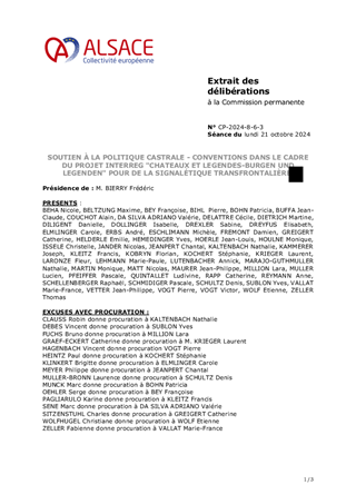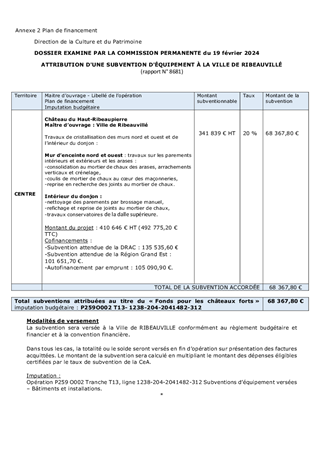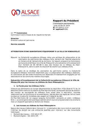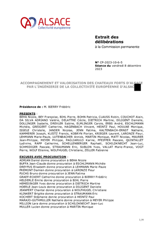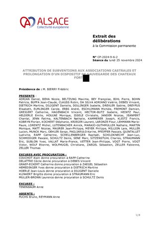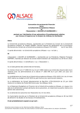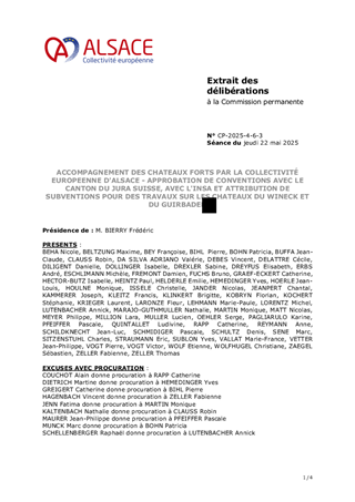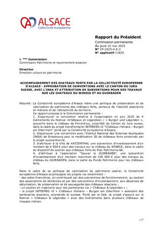 La Collectivité européenne d'Alsace mène une politique de préservation et de valorisation du patrimoine des châteaux forts, porteurs de l'identité alsacienne et rhénane et de l'attractivité du territoire. Ce rapport propose à la Commission permanente : 1. d'approuver la convention relative à l’organisation en juin 2025 de 4 évènements du festival «Châteaux et Légendes» / « Burgen und Legenden », accueillis dans le château de Porrentruy, propriété du Canton du Jura suisse, dans le cadre du projet transfrontalier INTERREG VI "Châteaux rhénans – Burgen am Oberrhein" porté par la Collectivité européenne d'Alsace. 2. d'approuver une convention avec l’Institut National des Sciences Appliquées (INSA) de Strasbourg pour la modélisation 3D de châteaux forts concernés par le projet susmentionné. 3. d'attribuer à la Ville de KATZENTHAL une subvention d'investissement d'un montant de 6 838 € pour des travaux sur le château du WINECK, dans le cadre du dispositif de soutien aux châteaux forts du Plan Patrimoine 68. 4. d'attribuer à l'association "Sauver le GUIRBADEN", une subvention d'investissement d'un montant maximum de 100 000 € pour des travaux au château du GUIRBADEN, dans le cadre du Fonds Patrimoine pour les châteaux forts.