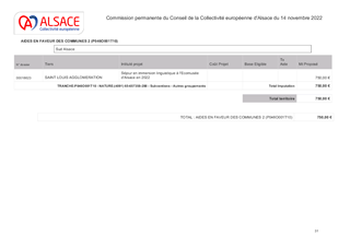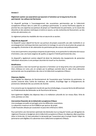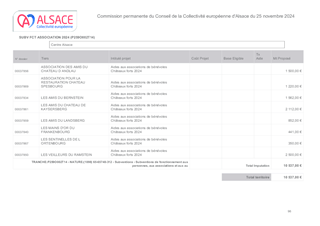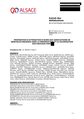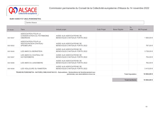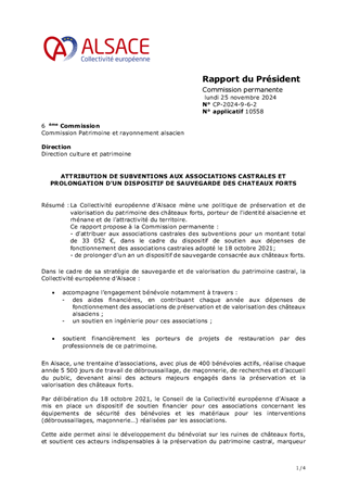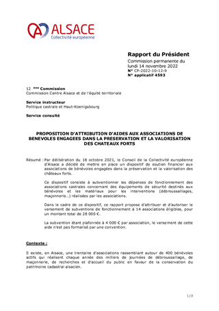 Par délibération du 18 octobre 2021, le Conseil de la Collectivité européenne d’Alsace a décidé de mettre en place un dispositif de soutien financier aux associations de bénévoles engagées dans la préservation et la valorisation des châteaux forts. Ce dispositif consiste à subventionner les dépenses de fonctionnement des associations castrales concernant des équipements de sécurité destinés aux bénévoles et les matériaux pour les interventions (débroussaillages, maçonnerie…) réalisées par les associations. Dans le cadre de ce dispositif, ce rapport propose d’attribuer et d’autoriser le versement de subventions de fonctionnement à 14 associations éligibles, pour un montant total de 28 000 €. La subvention étant plafonnée à 4 000 € par association, le versement de cette aide n'est pas formalisé par une convention.