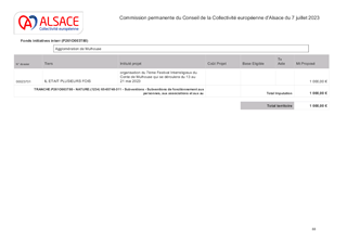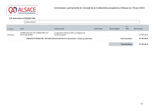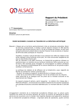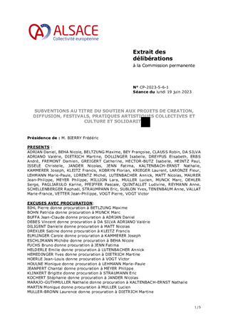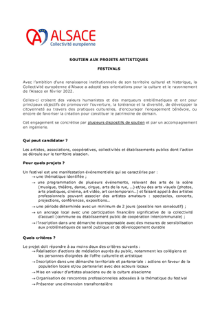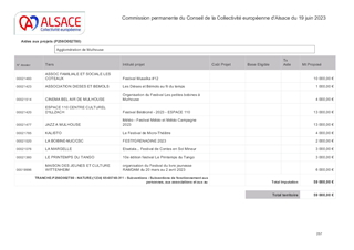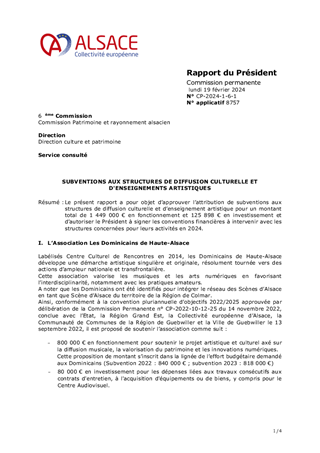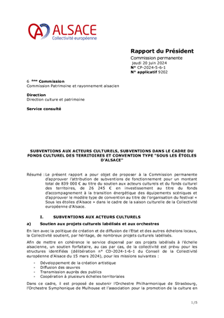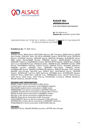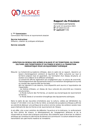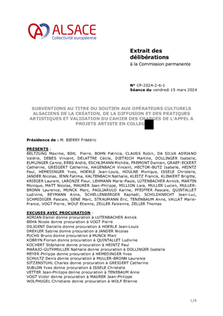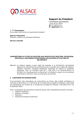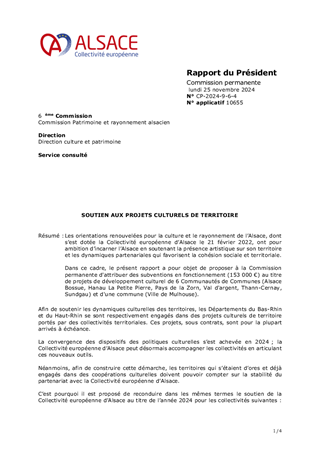 Les orientations renouvelées pour la culture et le rayonnement de l’Alsace, dont s’est dotée la Collectivité européenne d’Alsace le 21 février 2022, ont pour ambition d’incarner l’Alsace en soutenant la présence artistique sur son territoire et les dynamiques partenariales qui favorisent la cohésion sociale et territoriale. Dans ce cadre, le présent rapport a pour objet de proposer à la Commission permanente d'attribuer des subventions en fonctionnement (153 000 €) au titre de projets de développement culturel de 6 Communautés de Communes (Alsace Bossue, Hanau La Petite Pierre, Pays de la Zorn, Val d'argent, Thann-Cernay, Sundgau) et d'une commune (Ville de Mulhouse).