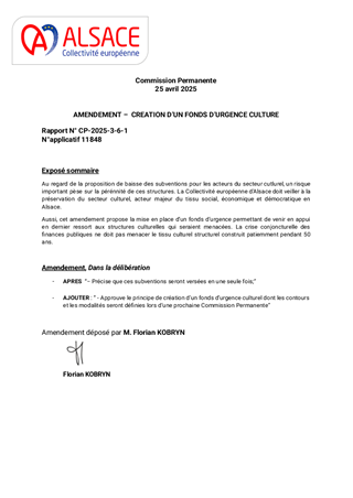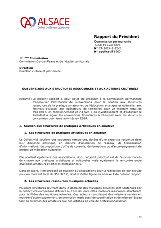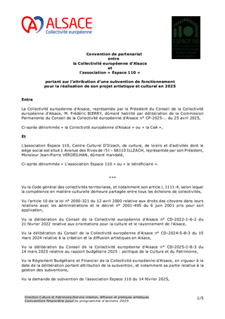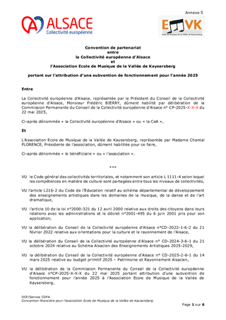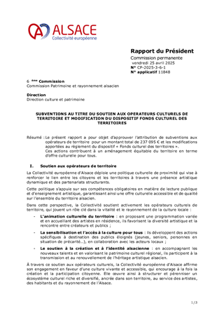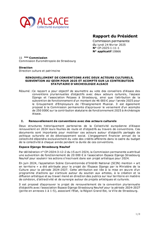 Ce rapport a pour objectif de soumettre au vote des conseillers d'Alsace des conventions pluriannuelles d'objectifs avec deux acteurs culturels, l'espace Django et l'association Pelpass à Strasbourg, ainsi que l'attribution de la subvention de fonctionnement d'un montant de 46 000 € pour l'année 2025 pour le Groupement d'Employeurs de l'Enseignement Musical. Il est également proposé à la Commission permanente d'approuver le versement d'un acompte de 250 000€ sur la contribution statutaire de fonctionnement 2025 à Archéologie Alsace.