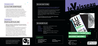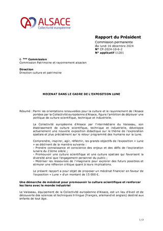 Parmi les orientations renouvelées pour la culture et le rayonnement de l’Alsace portées par la Collectivité européenne d’Alsace, figure l’ambition de déployer une politique de culture scientifique, technique et industrielle. La Collectivité européenne d’Alsace par l’intermédiaire du Vaisseau, son établissement de culture scientifique, technique et industrielle, développe actuellement une nouvelle exposition didactique sur le thème de l’exploration spatiale et plus précisément sur le retour programmé des humains sur la Lune. Comprendre, inspirer, agir, réfléchir, les grands objectifs de l’exposition « Lune » se déclinent de la manière suivante : - Prendre connaissance et conscience des enjeux et des défis de l’exploration lunaire du 21ème siècle ; - Promouvoir une culture scientifique et une culture spatiale qui favorisent la diversité ainsi que l’engagement personnel du public ; - Mobiliser les ressources de l’imaginaire pour explorer des futurs possibles et stimuler une réflexion critique quant à leurs implications. Le présent rapport a pour objet de proposer un mécénat financier en faveur de l’exposition « Lune » d'un montant de 15 000 €.