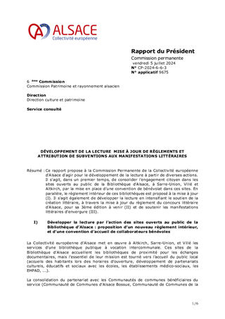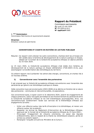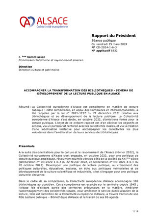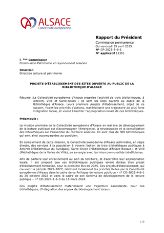 La Collectivité européenne d'Alsace organise l'activité de trois bibliothèques, à Altkirch, Villé et Sarre-Union ; ce sont les sites ouverts au public de la Bibliothèque d'Alsace. Leurs premiers projets d'établissement, objet de ce rapport, fixent les priorités d'actions, matérialisent une trajectoire de plus forte intégration locale, et visent à faciliter l'appropriation locale de ces bibliothèques.