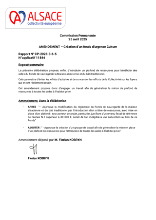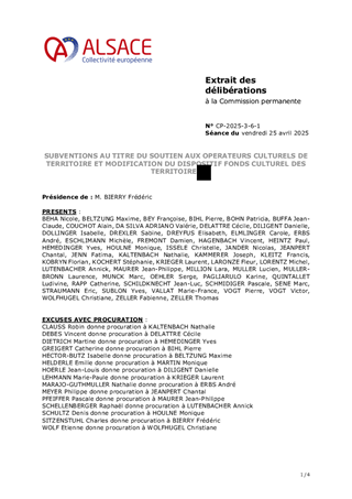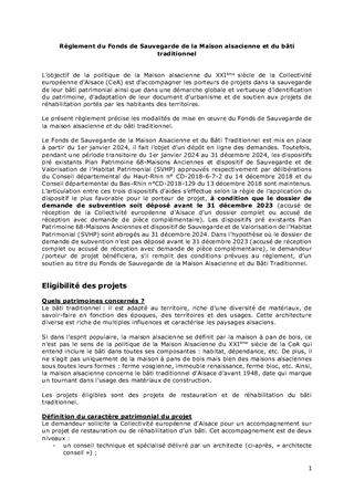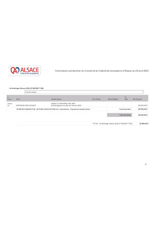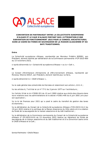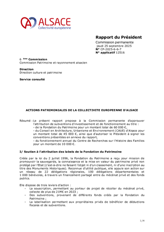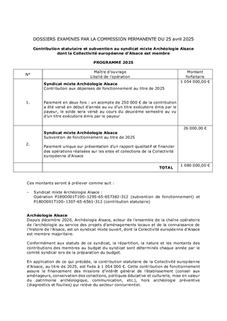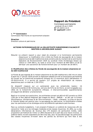 Le présent rapport a pour objet de proposer à la Commission permanente d'approuver la modification d'un critère du Fonds de sauvegarde de la maison alsacienne et du bâti traditionnel et de prendre acte du montant de la contribution statutaire de fonctionnement 2025 au syndicat mixte Archéologie Alsace qui s'élève à 1 054 000 €, du reste à verser d'un montant de 804 000 € et de lui attribuer une subvention de fonctionnement pour un montant de 26 000 €.