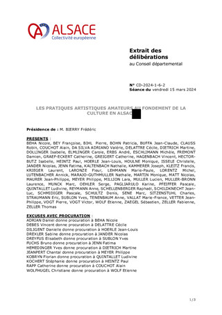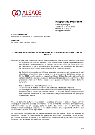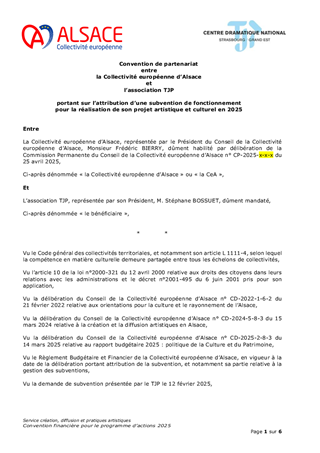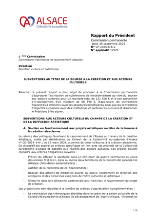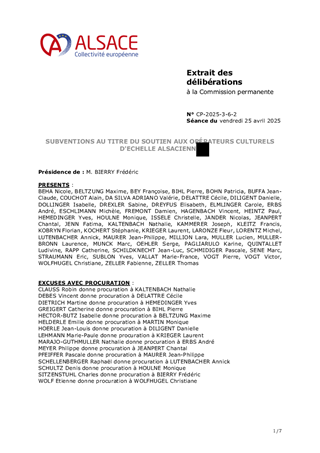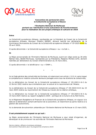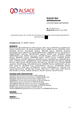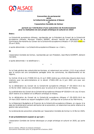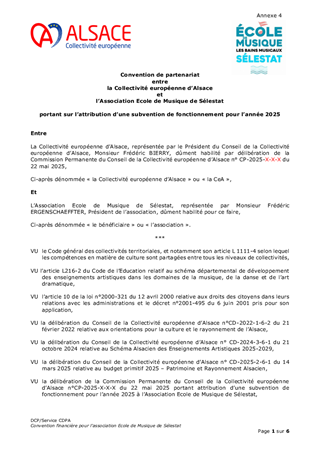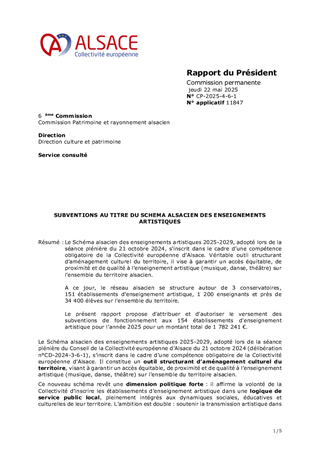 Le Schéma alsacien des enseignements artistiques 2025-2029, adopté lors de la séance plénière du 21 octobre 2024, s’inscrit dans le cadre d’une compétence obligatoire de la Collectivité européenne d’Alsace. Véritable outil structurant d’aménagement culturel du territoire, il vise à garantir un accès équitable, de proximité et de qualité à l’enseignement artistique (musique, danse, théâtre) sur l’ensemble du territoire alsacien. A ce jour, le réseau alsacien se structure autour de 3 conservatoires, 151 établissements d'enseignement artistique, 1 200 enseignants et près de 34 400 élèves sur l'ensemble du territoire. Le présent rapport propose d'attribuer et d'autoriser le versement des subventions de fonctionnement aux 154 établissements d'enseignement artistique pour l’année 2025 pour un montant total de 1 782 241 €.
