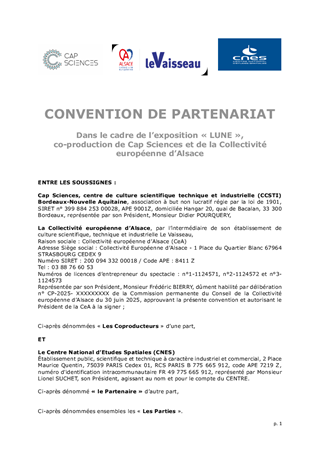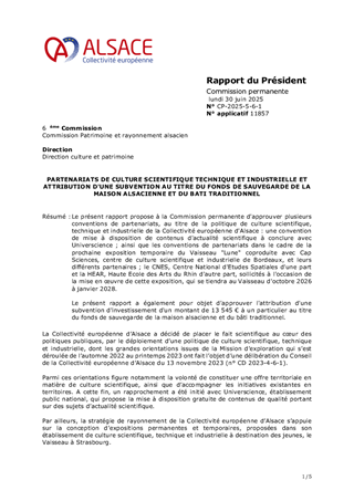 Le présent rapport propose à la Commission permanente d'approuver plusieurs conventions de partenariats, au titre de la politique de culture scientifique, technique et industrielle de la Collectivité européenne d'Alsace : une convention de mise à disposition de contenus d'actualité scientifique à conclure avec Universcience ; ainsi que les conventions de partenariats dans le cadre de la prochaine exposition temporaire du Vaisseau "Lune" coproduite avec Cap Sciences, centre de culture scientifique et industrielle de Bordeaux, et leurs différents partenaires ; le CNES, Centre National d'Etudes Spatiales d'une part et la HEAR, Haute Ecole des Arts du Rhin d'autre part, sollicités à l'occasion de la mise en œuvre de cette exposition, qui se tiendra au Vaisseau d'octobre 2026 à janvier 2028. Le présent rapport a également pour objet d'approuver l'attribution d'une subvention d'investissement d'un montant de 13 545 € à un particulier au titre du fonds de sauvegarde de la maison alsacienne et du bâti traditionnel.