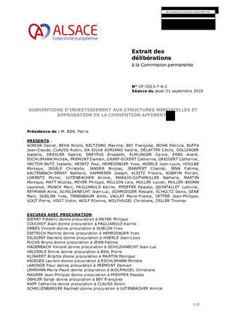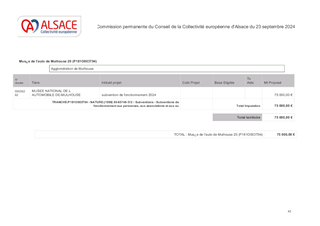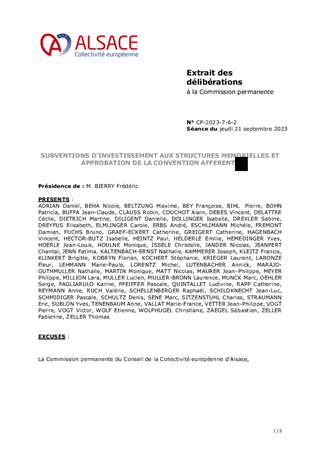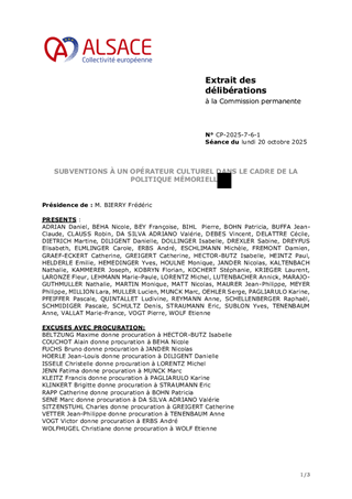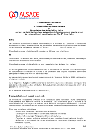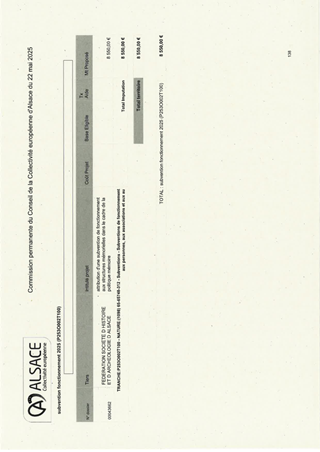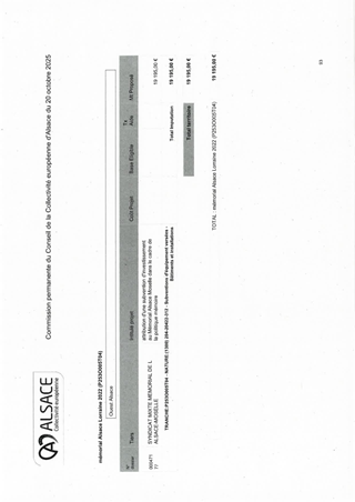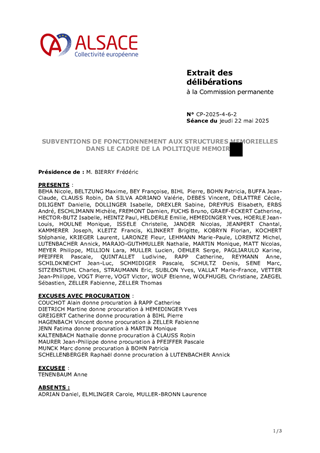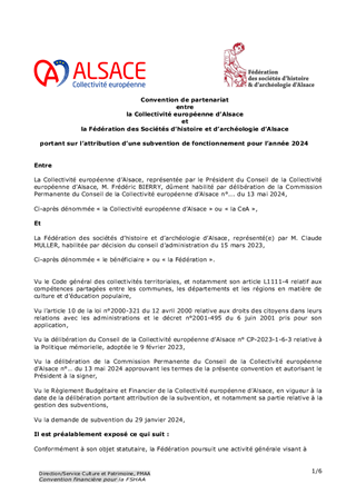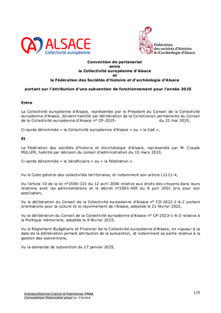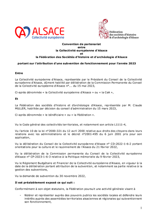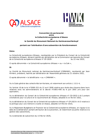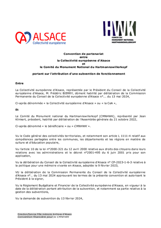 Le 9 février 2023, la Collectivité européenne d’Alsace s’est dotée d’une nouvelle politique pour une mémoire vivante en Alsace dans toute sa dimension historique. Dans un souci de neutralité et visant une approche scientifique et apaisée des mémoires à l’œuvre sur notre territoire, la Collectivité européenne d'Alsace entend faire rayonner ce patrimoine en Europe et oeuvrer à la vie démocratique. En déclinaison de ces orientations, le présent rapport propose à la Commission permanente d’attribuer des subventions de fonctionnement à la Fédération des Sociétés d'Histoire et d'Archéologie d'Alsace (8 550 €), au Comité du Monument National du Hartmannswillerkopf (28 500 €) et à l'association Mémoires des Images Réanimées d'Alsace MIRA (15 200 €) ainsi que d'approuver les termes des conventions de partenariat afférentes et d'autoriser le Président à les signer.