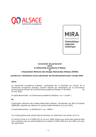 L’association Mémoire des Images Réanimées d'Alsace (MIRA) sauvegarde, enrichit et valorise le patrimoine audiovisuel amateur alsacien, par un travail de collecte, de numérisation, d’inventaire et de valorisation sous des formes multiples de films amateur ou inédits réalisés par des Alsaciens ou sur l’Alsace depuis les débuts du cinéma. L’association se trouve aujourd’hui dans la nécessité de trouver un lieu de stockage temporaire pour des films qu’elle a collectés et qui sont en instance de traitement, dans la mesure où les espaces de conservation de ses films doivent être temporairement libérés pour travaux.