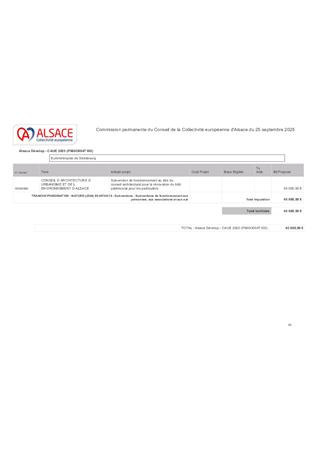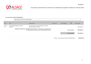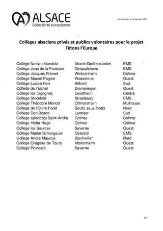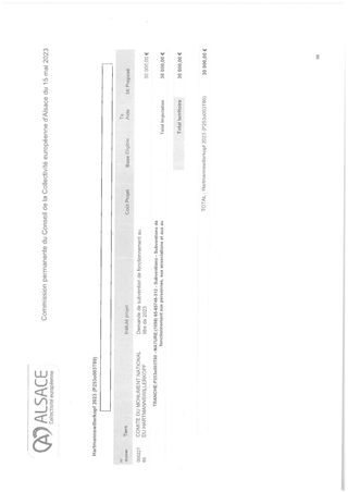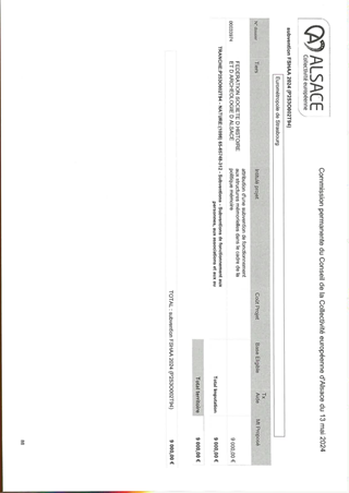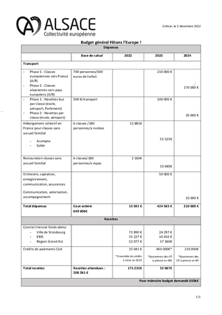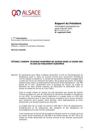 En partenariat avec l’Etat, la Région Grand-Est, la Ville et l’Eurométropole de Strasbourg, dans le cadre du contrat triennal pour promouvoir Strasbourg comme capitale européenne, la Collectivité européenne d’Alsace s’engage dans le cadre des 70 ans du Parlement Européen. Elle propose de jumeler 26 collèges alsaciens avec chacun un établissement scolaire de l’Union Européenne : soit 700 jeunes de 12 ans, représentant ainsi la jeunesse de l’Union. Ce projet se déroulera sur deux années scolaires, en 2022/2023 et 2023/2024, avec un accueil en Alsace du 28 mai au 3 juin 2023. C’est un projet citoyen et culturel qui doit permettre aux jeunes de chanter l’hymne européen au sein de l’hémicycle du Parlement Européen à Strasbourg en mai 2023. Ce jumelage prévoit également un voyage retour en 2024 des collégiens alsaciens dans le pays des jeunes européens qu’ils auront accueillis pour construire entre jeunes, entre familles, entre établissements et entre collectivités, une Europe citoyenne et culturelle. Le budget total de ce projet est estimé à 650 000 € (frais de déplacements, d’hébergement et de restauration des collégiens et des délégations les accompagnant ainsi que les frais artistiques). Il est proposé que la Collectivité européenne d’Alsace prenne en charge ces frais au moyen d’une enveloppe de 260 000 € de fonds propres, de 181 739 € de crédits du Fonds démocratie du Contrat triennal et par diverses subventions publiques.